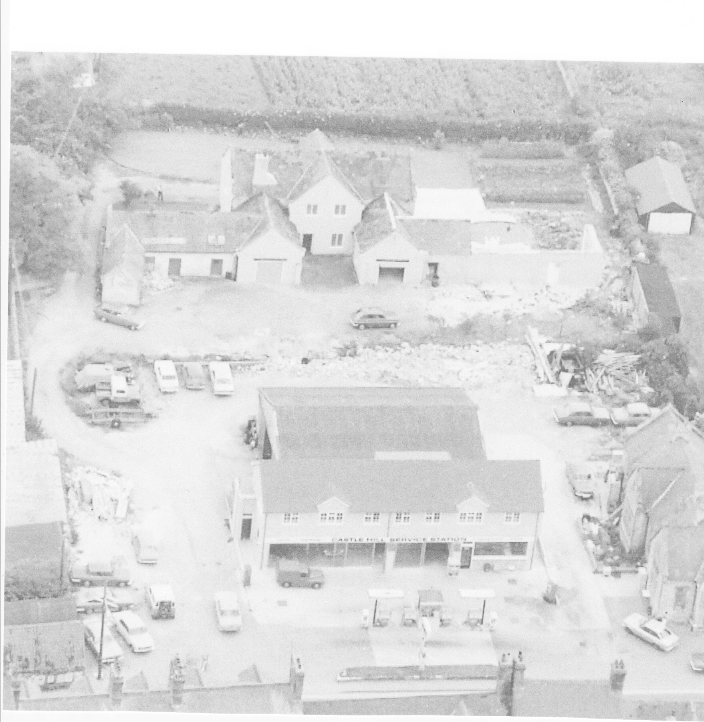 Brief description: Ariel colour photograph of the workhouse during demolition, showing the Castle Hill garage in the foreground.
