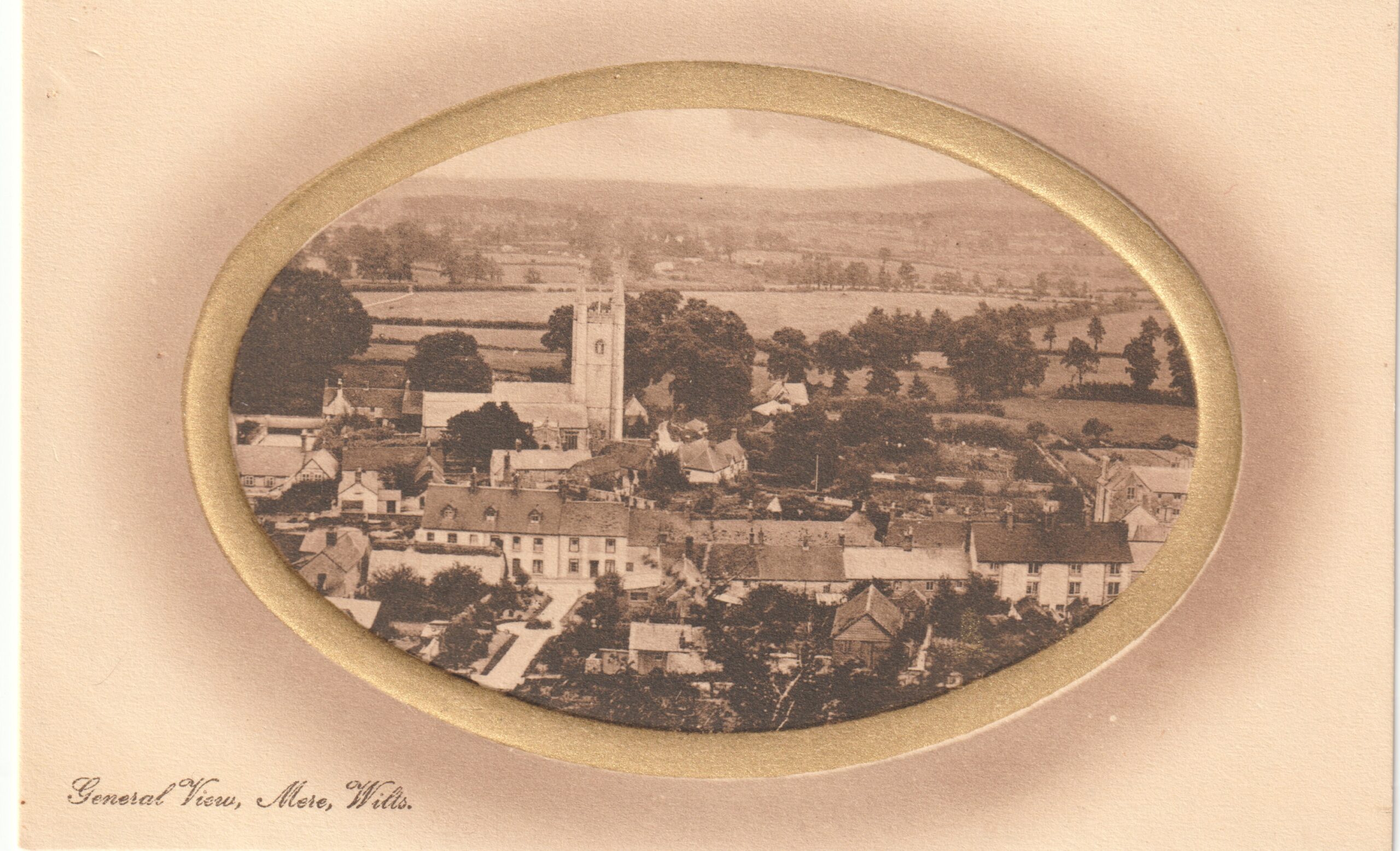 Brief description: black and white postcard by Raphael Tuck, second one now owned by the Museum. View of Mere and the church from Castle Hill, in a gold frame in sepia.