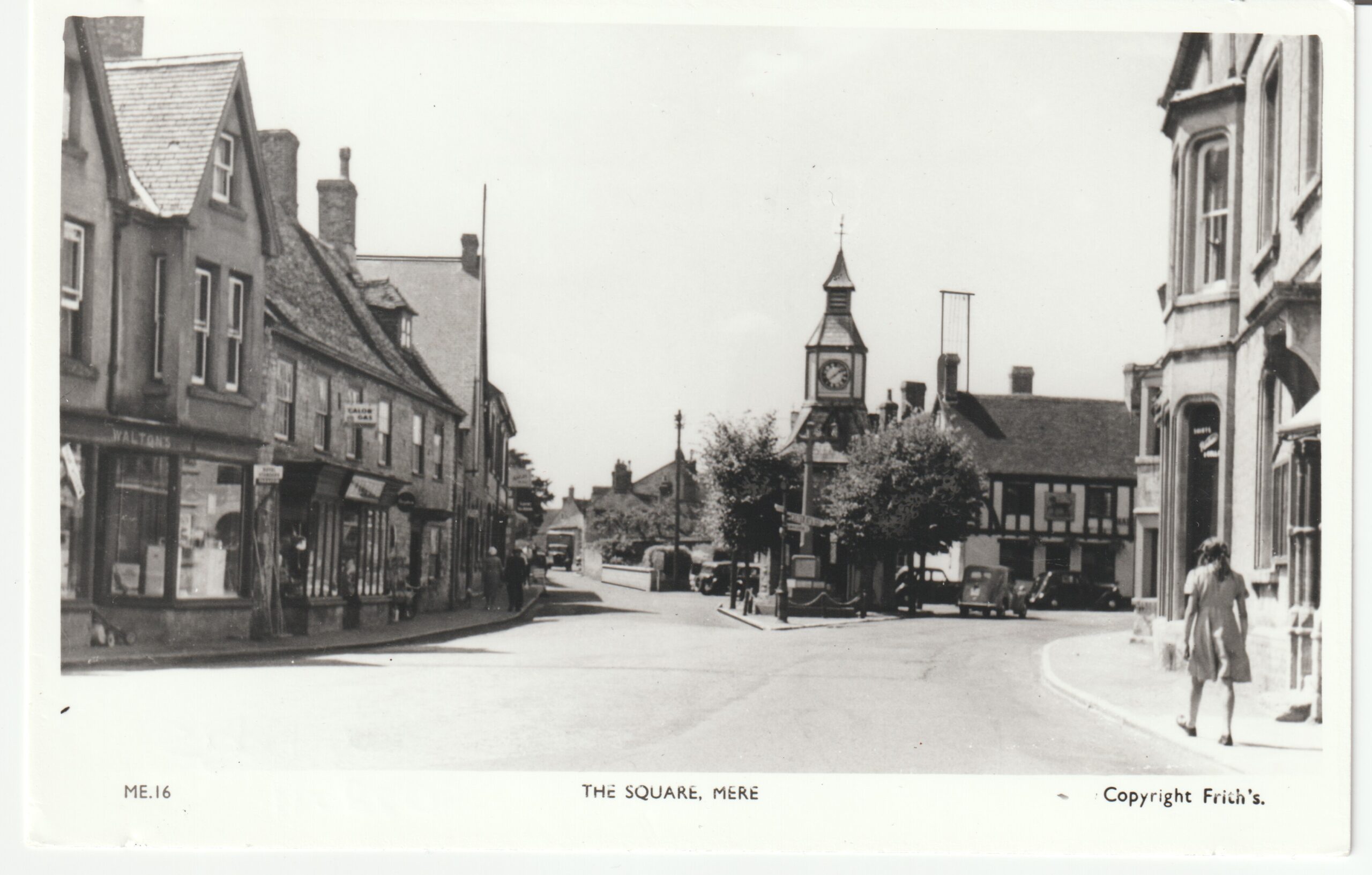 Brief description: black and white postcard by Frith showing Mere town centre looking towards the clock tower and Church Street