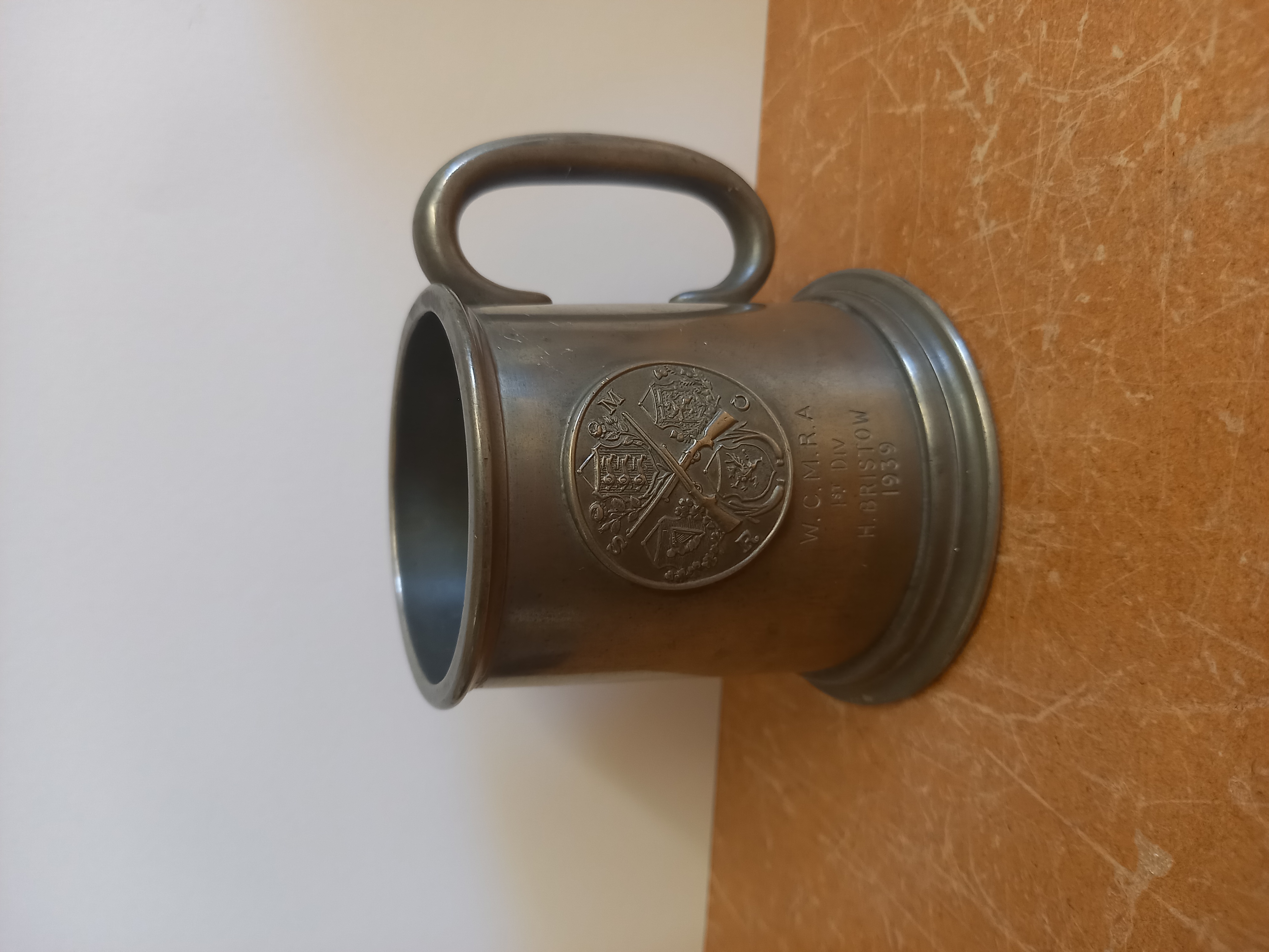 Brief description: Wiltshire County miniature rifle association, first division pewter tankard awarded to H.J. Bristow in 1939.
