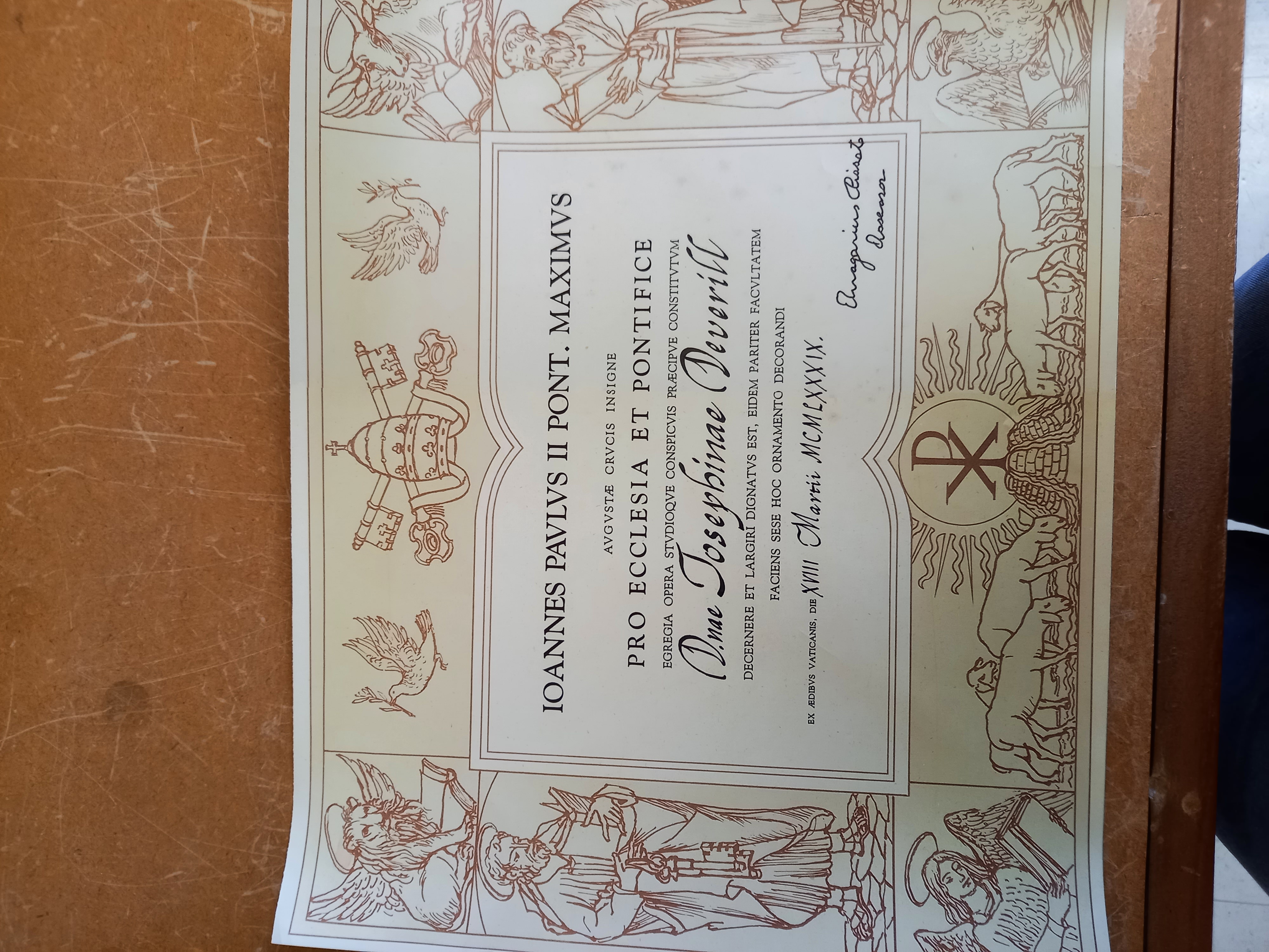 Brief description: coloured scroll from the Pope, John Paul II. This was presented to Josephine Evelyn Deverill by Bishop Mervyn Alexander in 1989. The document is dated 18th March 1989.