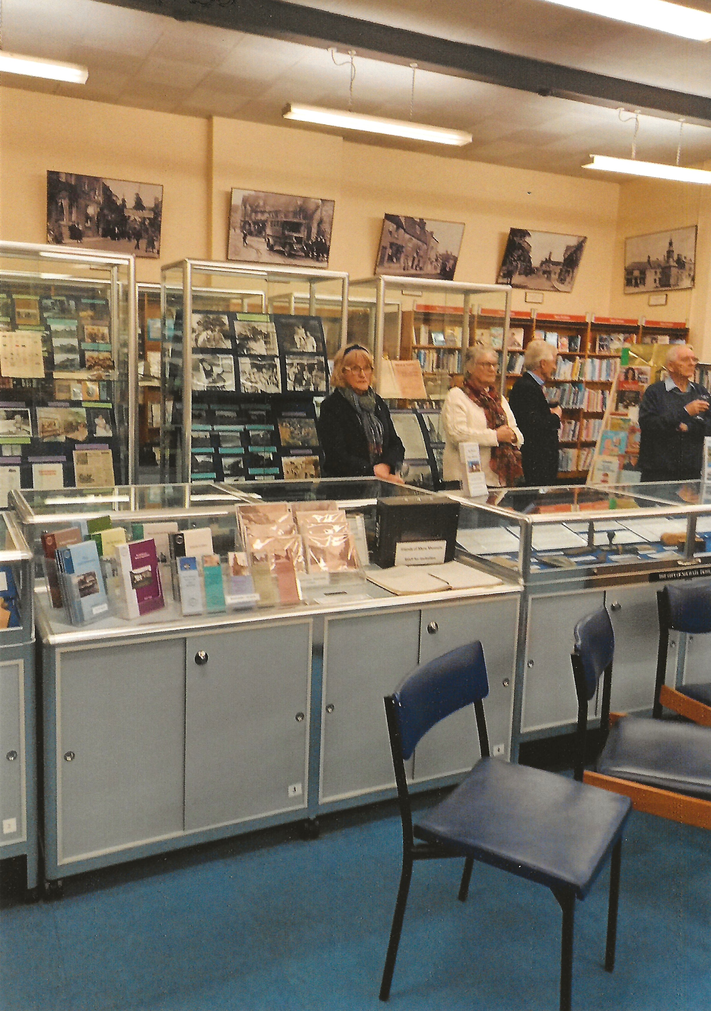 Brief description: coloured photograph showing the display cabinets, Pat Whitehead (museum volunteer)